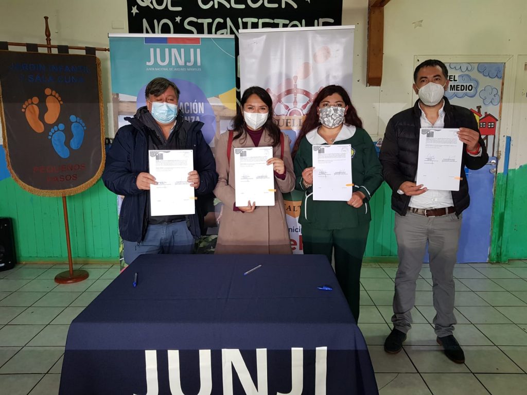 Tras una serie de gestiones finalmente se firmó el convenio para la normalización del Jardín Infantil y Sala Cuna “Pequeños Pasos” de Quellón entre la Municipalidad de Quellón y la Junta Nacional de Jardines Infantiles. Este es el inicio del proceso que permitirá el reconocimiento oficial de parte de la JUNJI, que incluye mejoras importantes en su infraestructura, ampliando la superficie actual del edificio y dotándolo con las implementaciones que exige la normativa requerida.